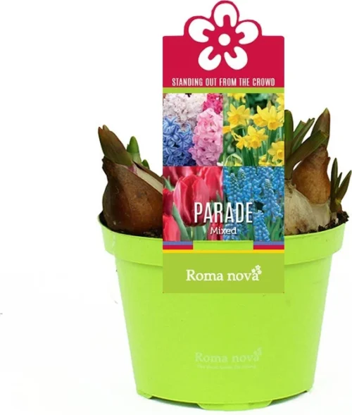 Verschillende soorten bollen in 1 potje. Deze selectie bloeit met verschillende kleuren.