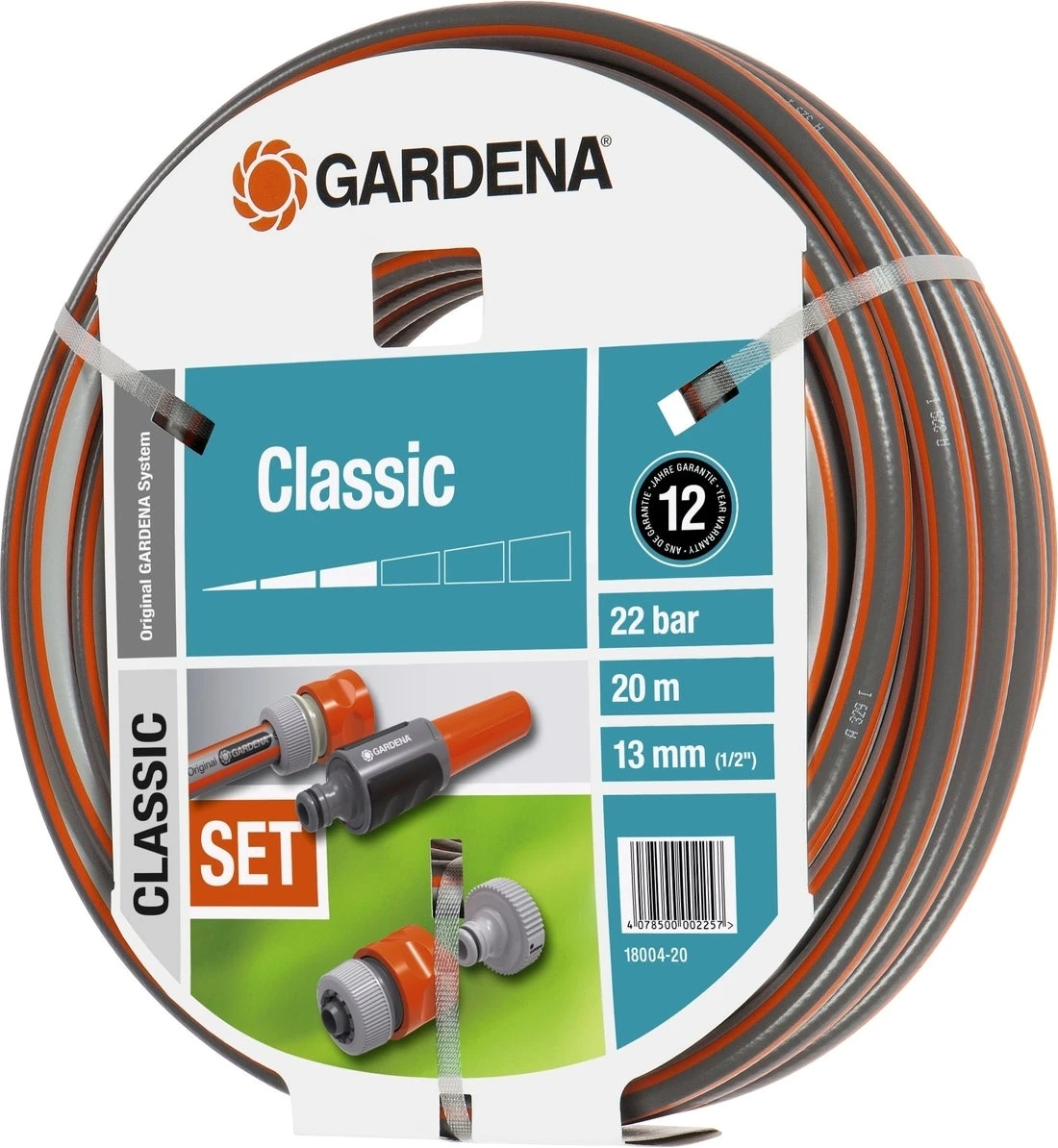 Deze verpakking bevat de Gardena Classic slang en diverse Gardena aansluitarmaturen. De drukbestendige slang, die zijn vorm behoudt door het gebruik van hoogwaardige textiel, is vrij van schadelijke weekmakers (ftalaten) en zware metalen, en is natuurlijk UV-bestendig.