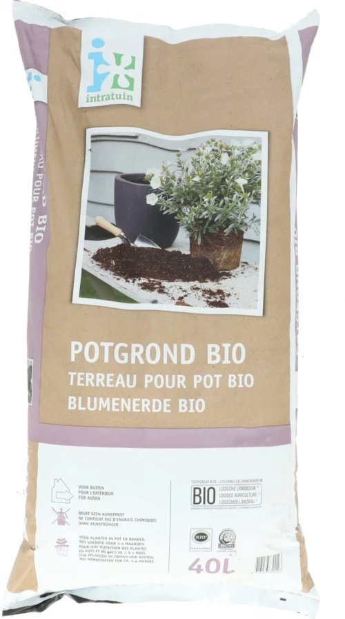 Intratuin potgrond Bio is een biologische samenstelling op basis van o.a. tuinturf, rijstkaf en boomschors. Verder bevat de potgrond een voedingsmix, waardoor de potgrond voldoende voeding geeft voor 3 tot 4 maanden. Door de zorgvuldige samenstelling geeft het planten een goede natuurlijke start.