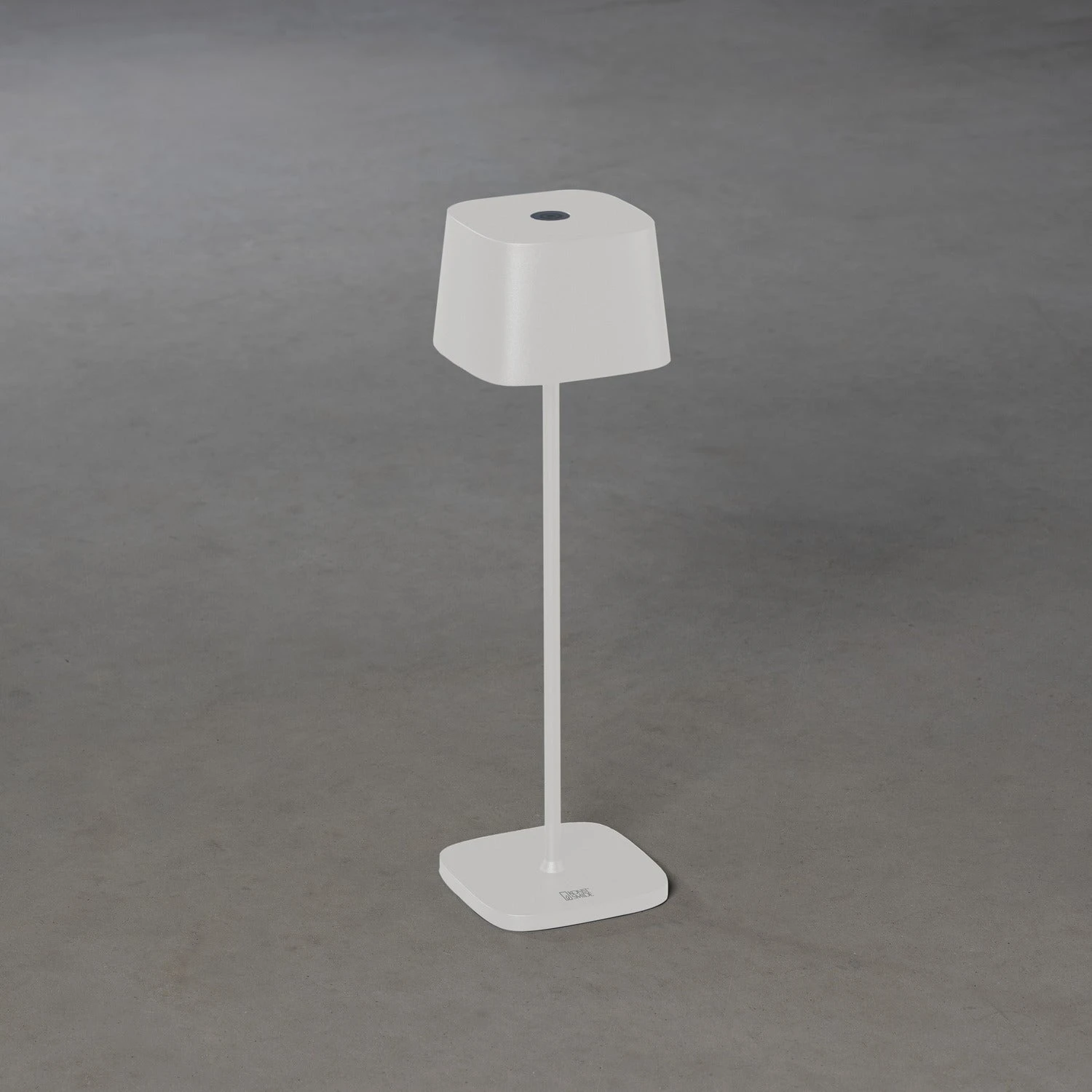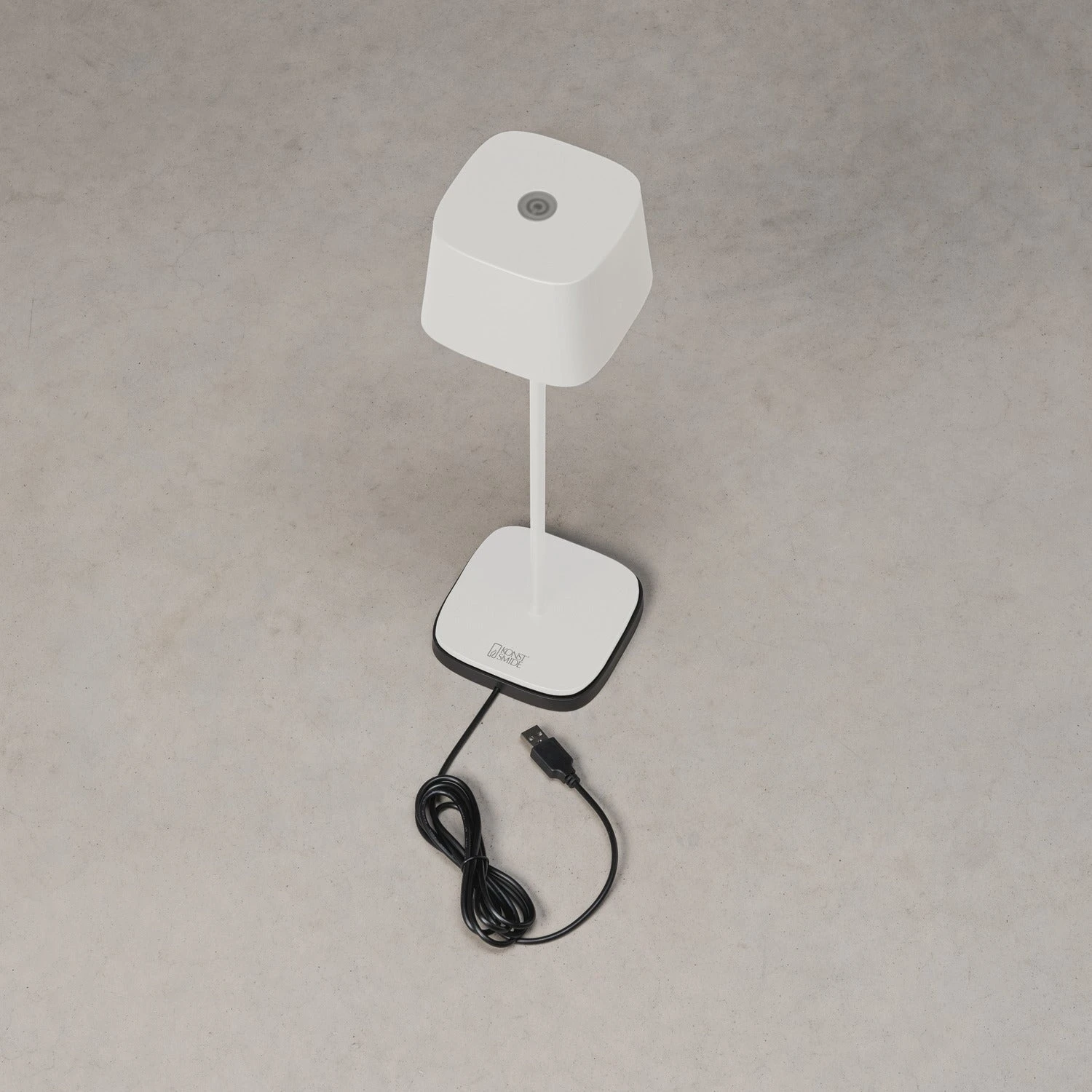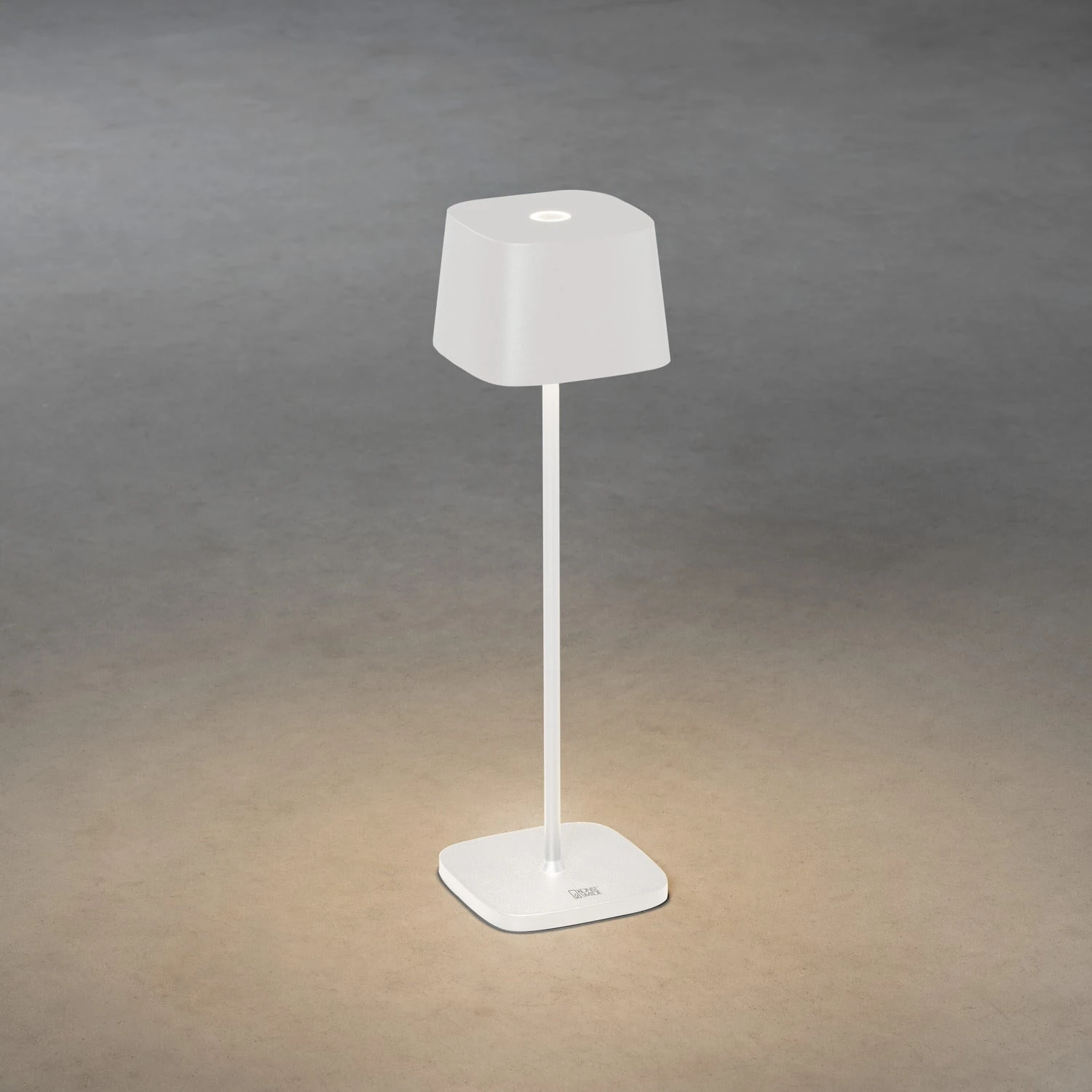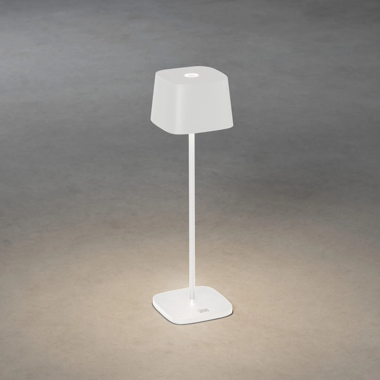 Deze USB-oplaadbare, draadloze terras/serre/lounge vierkante LED-tafellamp Capri 7814 op batterij is een matwitte aluminium tafellamp van het Zweedse premiummerk Konstsmide.