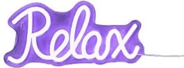 De Luca Lighting wandlamp, met een opvallende neon paarse verlichting, vormt het woord “relax” als een kunstzinnig statement. Het gestileerde ontwerp creëert een eigentijdse en rustgevende sfeer, waarbij het woord zelf een kunstzinnig element toevoegt aan de verlichting.