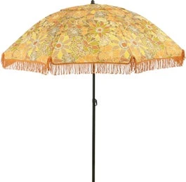 Geniet van de zon in stijl met de parasol van Mica Decorations. Het vrolijke ontwerp met bloemenprint in gele tinten en speelse franjes voegen een prachtig accent toe aan jouw buitenruimte. Met een hoogte van 238 cm en een diameter van 220 cm biedt deze parasol voldoende schaduw op warme, zonnige dagen. De parasol is eenvoudig mee te nemen dankzij de meegeleverde hoes, die ook als handige tas fungeert – handig! Hij is perfect voor in de tuin, op het terras of tijdens een picknick.