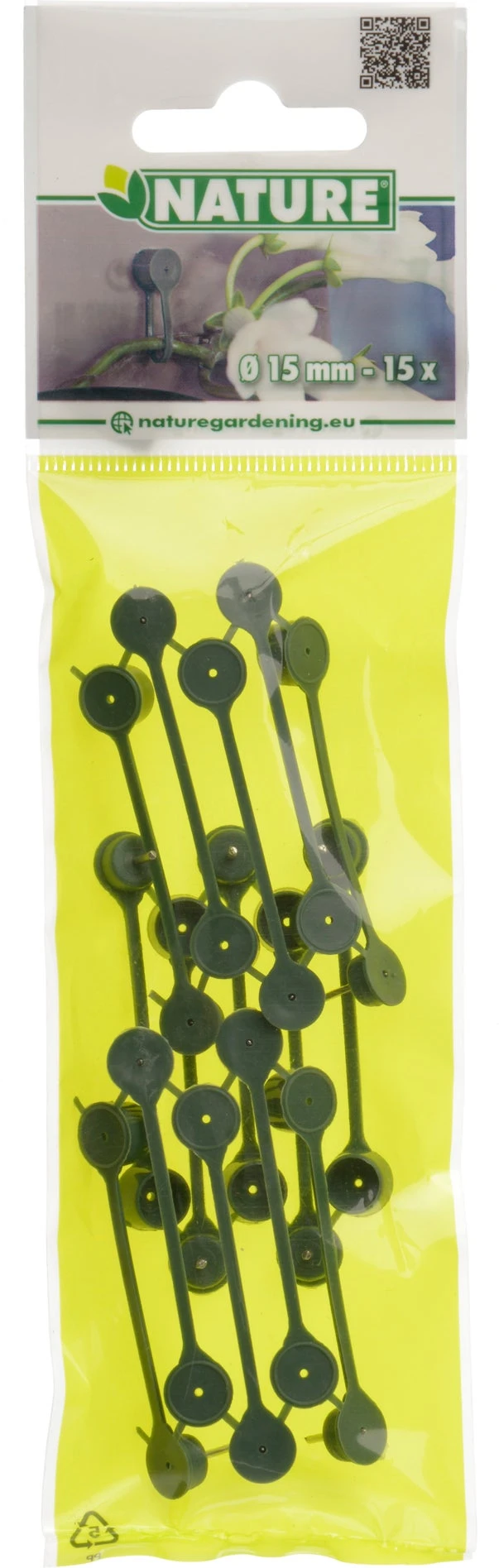 Nature groene kunststof plantenklemmen voorzien van klikverbinding. Geschikt voor takken met een diameter tot 15mm. Inhoud 15 stuks.