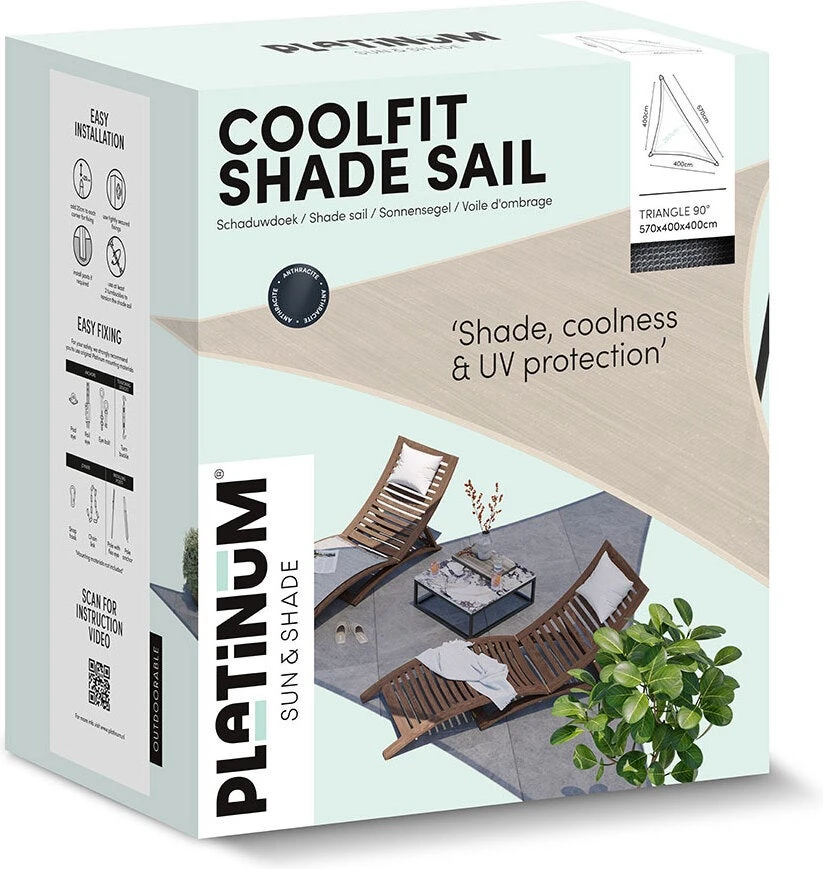 Creëer een aangename en koele schaduwplek in jouw tuin, terras of balkon met dit Platinum schaduwdoek uit de Sun & Shade Coolfit serie in de kleur wit. Dit hoogwaardige schaduwdoek in de vorm van een driehoek biedt niet alleen effectieve bescherming tegen de zon, maar voegt ook een stijlvol element toe.