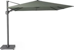 Platinum Sun & Shade zweefparasol Challenger T² 300×300 olijf. Design| Modern design. Stabiliteit| Uiterst stabiel. Gebruiksgemak| Makkelijk te openen en sluiten. Schaduwvlak| Geeft de gehele dag door schaduw zonder de parasol te verplaatsen door T² achterwaartse & zijwaartse kantelbaarheid en de 360° draaibare voet. Doekkwaliteit| Het zware 300 grams polyester doek in de kleur olijf blijft lang mooi en biedt goede bescherming tegen de zon; tot 96% UV protectie. Het doek is voorzien van water- en vuilafstotende coating en doekspanners. Parasolvoet| De parasol wordt zonder voet geleverd. Wij adviseren deze parasol op een 90kg parasolvoet van Platinum Sun & Shade te plaatsen. Deze zijn uitgevoerd met zwenkwielen zodat de parasol makkelijk te verplaatsen is. Platinum Sun & Shade biedt ook een ingraaf parasolvoet (art.nr. 6900). De ingraaf parasolvoet is geheel verwerkt in de grond. Hierdoor heeft u meer ruimte op uw terras. De ingraafvoet is makkelijk te plaatsen zonder gebruik van beton. Parasolhoes| Houd uw parasol als nieuw en dek deze af met een AeroCover ademende parasolhoes (art.nr. 7970) wanneer u deze langere tijd niet gebruikt.