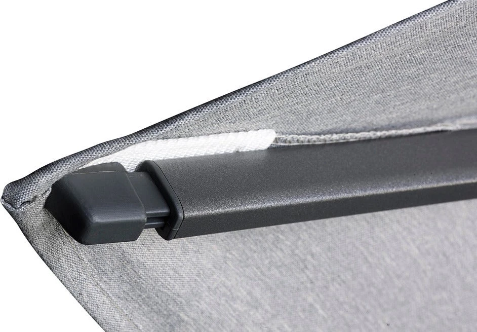 De doekspanners aan de baleinen zijn gemaakt van aluminium en zorgen ervoor dat het doek altijd optimaal gespannen is. De robuuste mast en gegoten aluminium behuizing voor het draaimechanisme staan garant voor een stevige constructie en jarenlang plezier van de parasol.