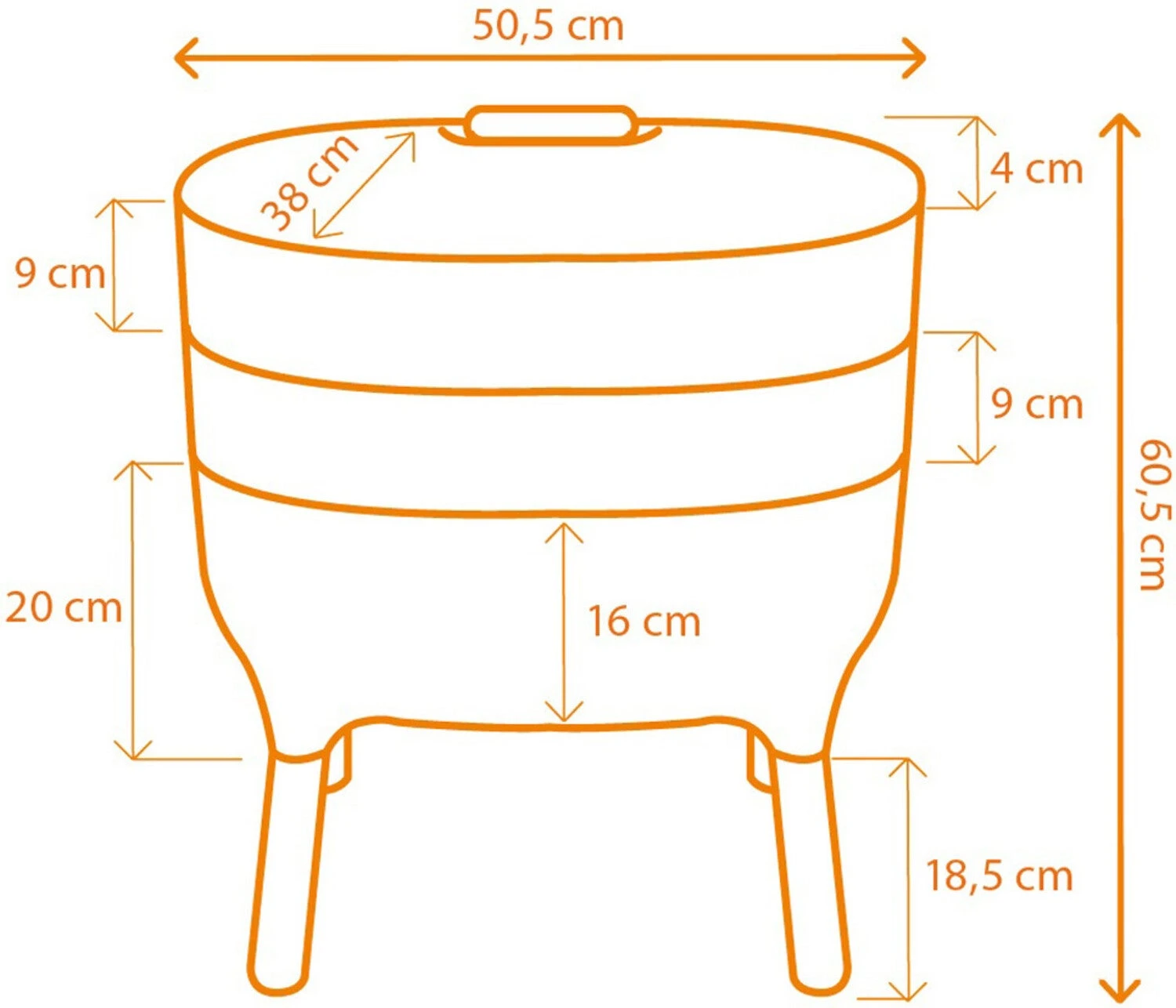 De wormenbak bestaat uit een onderbak op poten, een groentebak, een uitbreidingsbak, textielrooster en schepje.